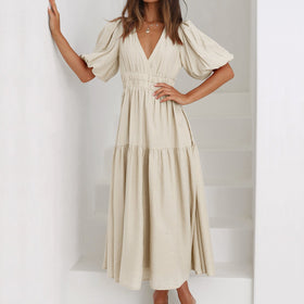 Dieses weiche, elegante V-Ausschnitt-Kleid unterstreicht deine Figur und sorgt für einen tollen Look. Kunden lieben es! Es schmeichelt deiner Körperform und ist dabei extrem bequem.
