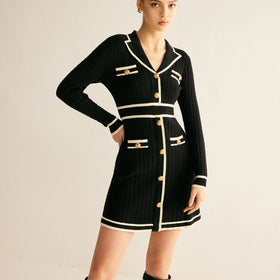 Dieses Midi-Kleid hat einen klassischen Schnitt mit langen Ärmeln und dezenten weißen Elementen, die einen eleganten Kontrast zu der tiefschwarzen Farbe bilden. Das Kleid ist aus luxuriösen Stoffen gefertigt, fühlt sich weich an und hat einen subtilen Glanz, der seine Qualität unterstreicht. Die Passform wurde sorgfältig entworfen, um einen raffinierten Look zu kreieren, mit viel Liebe zum Detail.