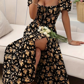Seien Sie im Frühling und Sommer die strahlende Erscheinung mit unserem Gelben Blumenmuster-Kleid, das Romantik und modernen Stil vereint. Dieses Midikleid mit Puffärmeln und A-Linien-Design ist ideal für einen femininen, eleganten Look.