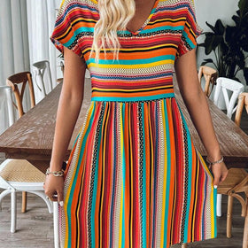 Einteiler-Midikleid mit V-Ausschnitt und kurzen Ärmeln. Lässiger Pendler-Stil, zum Reinrutschen, bedruckt.